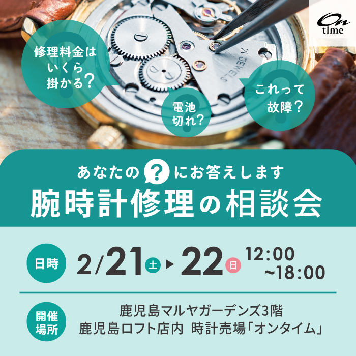 「時計修理技能士」の資格を持った専門家が、あなたの?にお答え!腕時計についてじっくり話せる修理相談会を開催いたします。大切な腕時計が止まってしまった・ベルトの劣化や汚れが気になる!等、腕時計について気になることはございませんか?また、ロレックスやオメガをはじめ、舶来ブランドの腕時計や他店で修理を断られた腕時計についてもお気軽にご相談下さい。