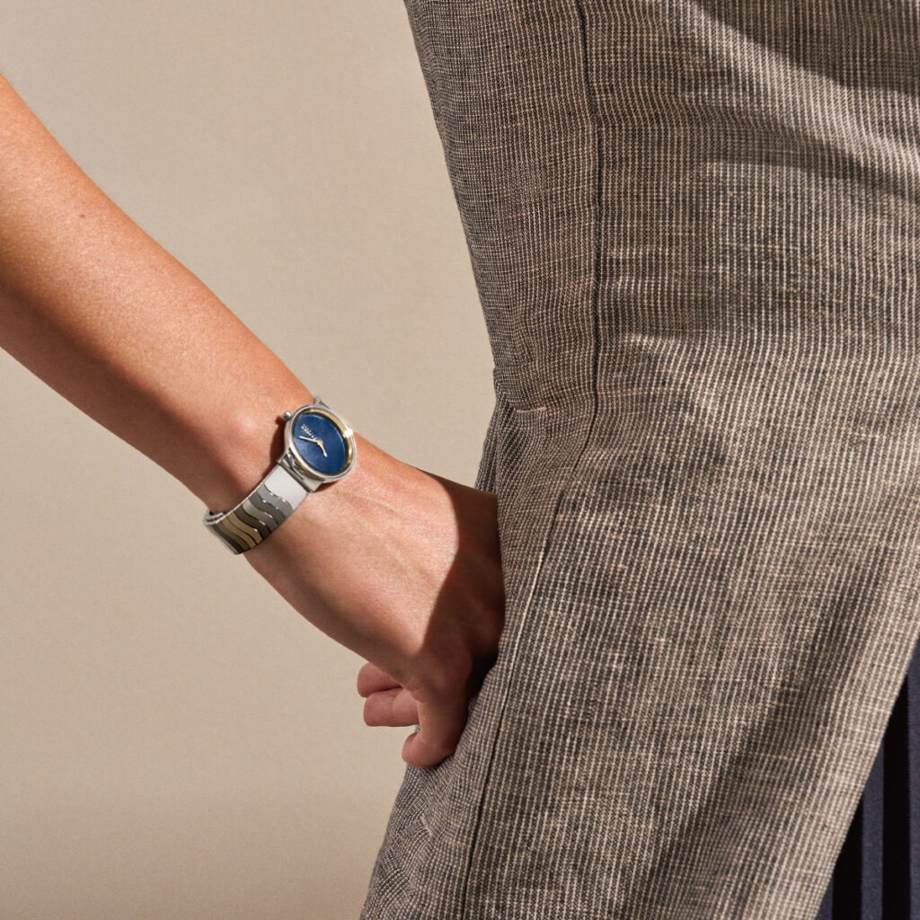 スカーゲン北半島の海岸からインスピレーションを得てFrejaは、優しい輝きをもつマザーオブパールで彩られています。月や星が海面に煌めくようなさりげないゴールド使いが上品な華やかさを演出します。