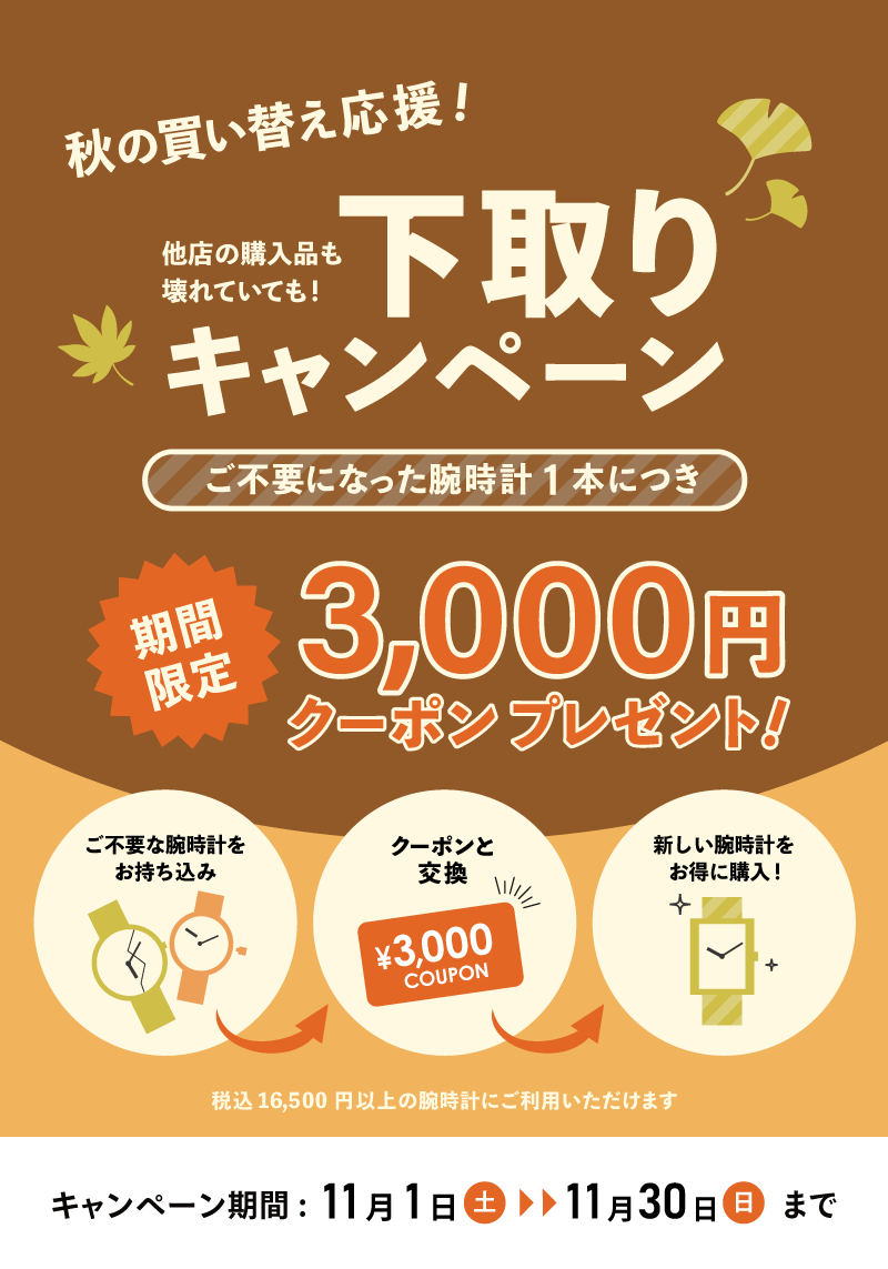 11月1日(土)~11月30日(日)下取りキャンペーンを開催します。ご不要になった腕時計をお持ちいただくと、期間限定で税込16,500円以上の腕時計に使える税込3,300円クーポンまたは税込み11,000円以上から使える【2,000円クーポン】をプレゼント!この機会にお得に腕時計をゲットしませんか。