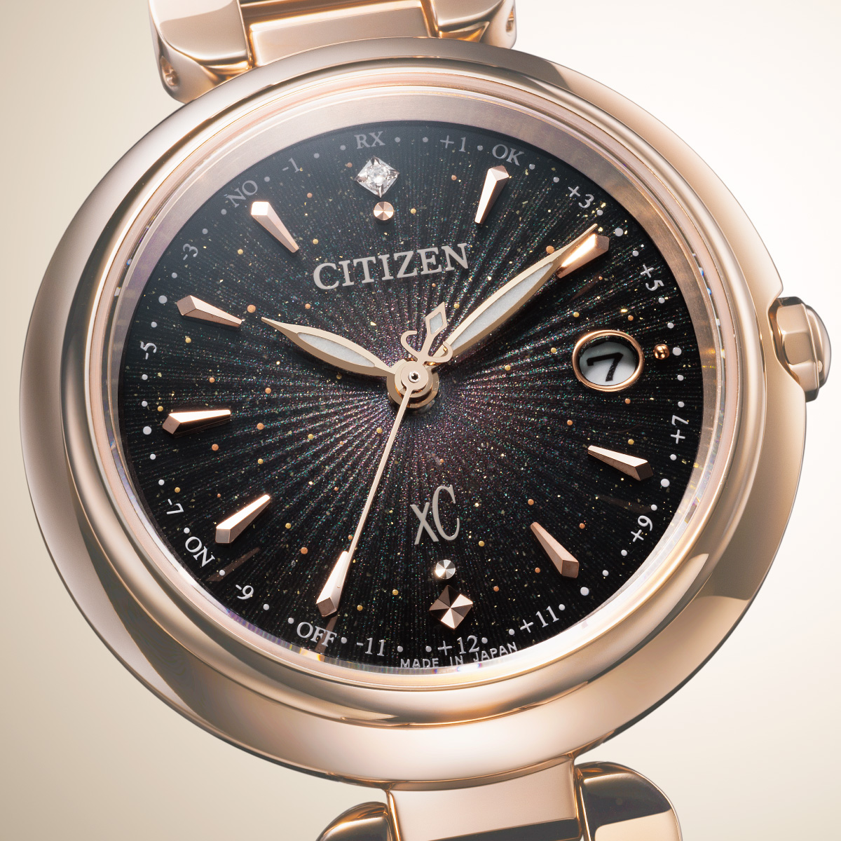 ピンクゴールドカラーのベゼルに合わせ、ピンクのラメを練り込むことで柔らかな輝きを添えています。派手に見えそうなピンクゴールドのアクセントが、着けてみると肌なじみが良く、ブラック文字板と合わせることで、高級感と柔らかい印象を与えてくれます。