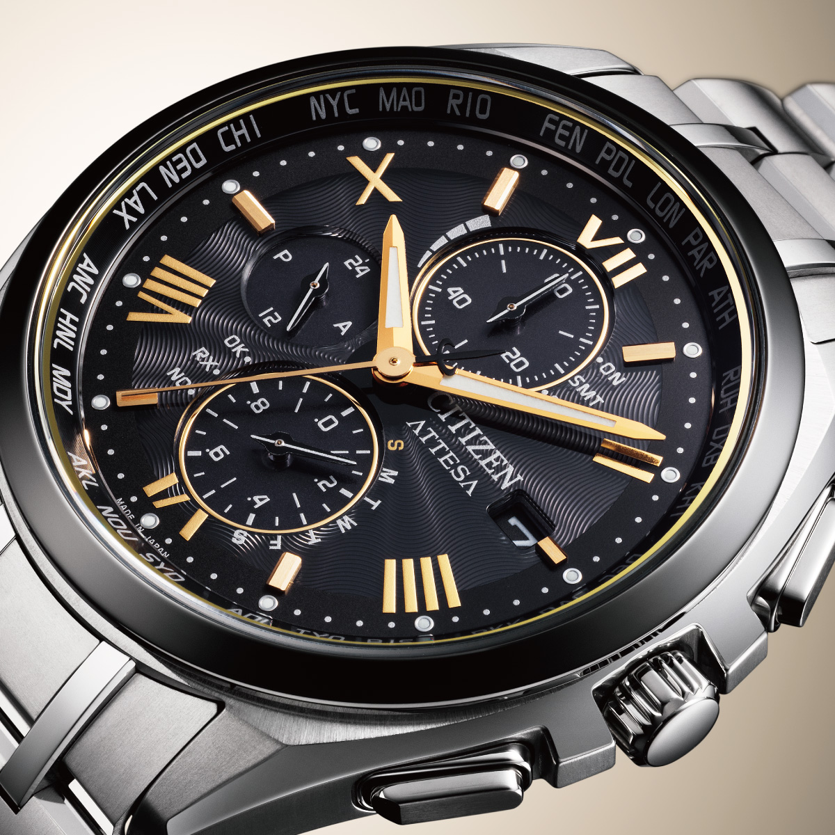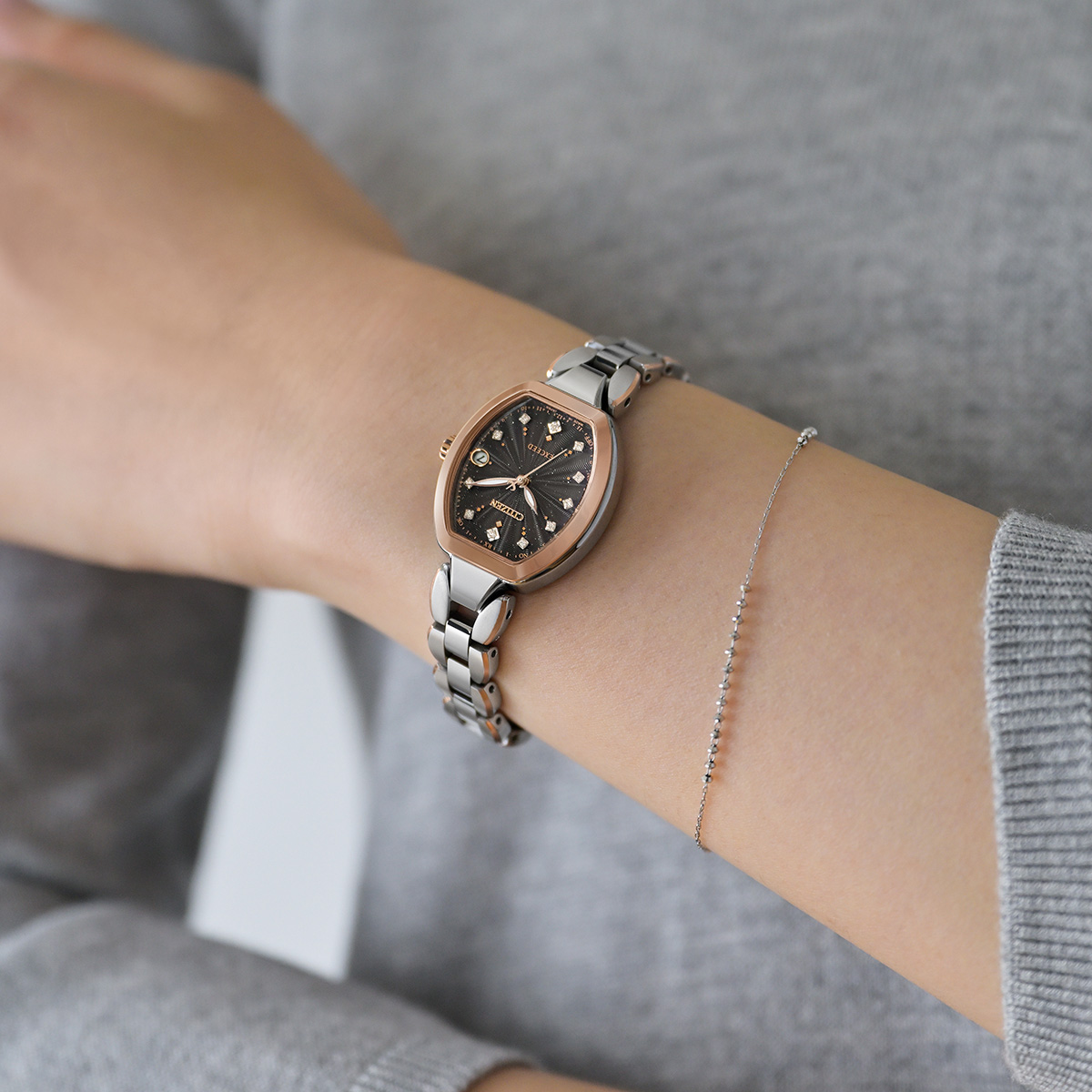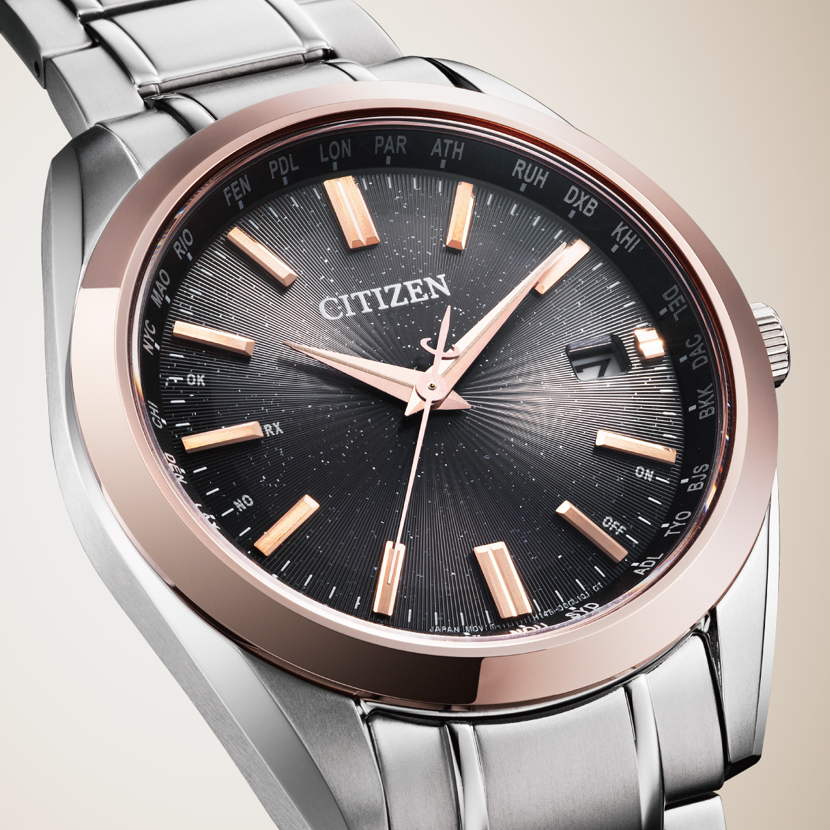 中心から放射状に光が伸びるサンレイをイメージしたブラック文字盤に、インダイヤルのリング、針やローマ数字などバランスよくゴールドを取り入れた、ブラック&ゴールドのコントラストが限定感と華やかさのあるデザインです。ロングセラーの薄型人気モデル「AT8040」をベースにしているので、薄さ9.7mmのケースがスマートに手首にフィットします。