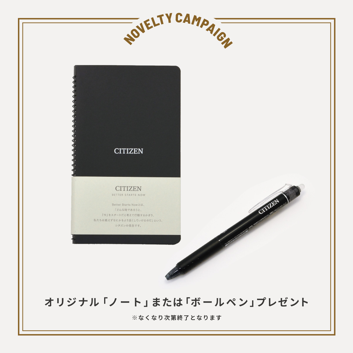 期間中シチズンの腕時計(アテッサ、エクシード、クロスシー、シチズンコレクション)をお買い上げの方に、先着でオリジナルノートまたはボールペンをプレゼント。なくなり次第終了となりますので、お早めにご利用ください。