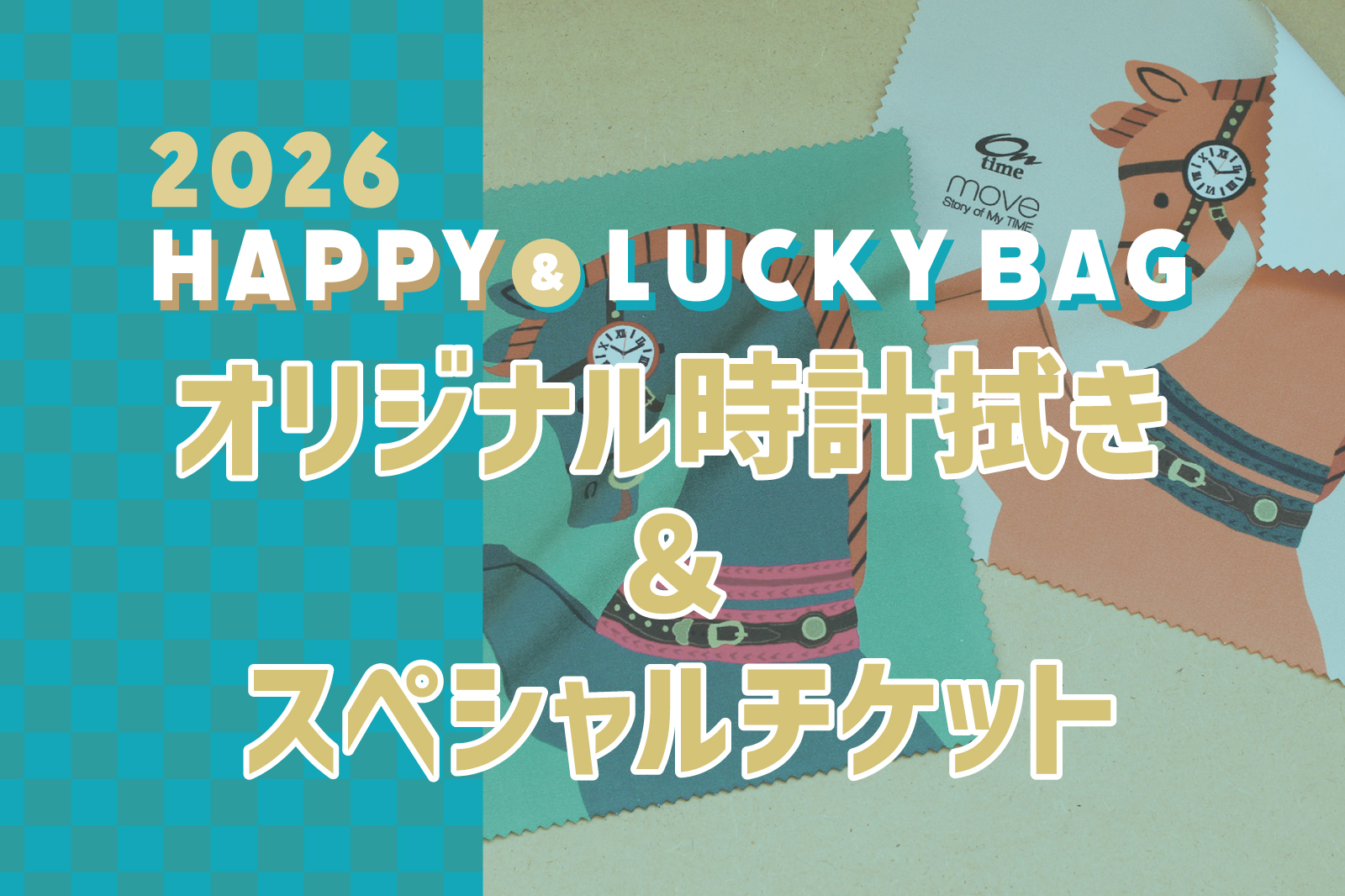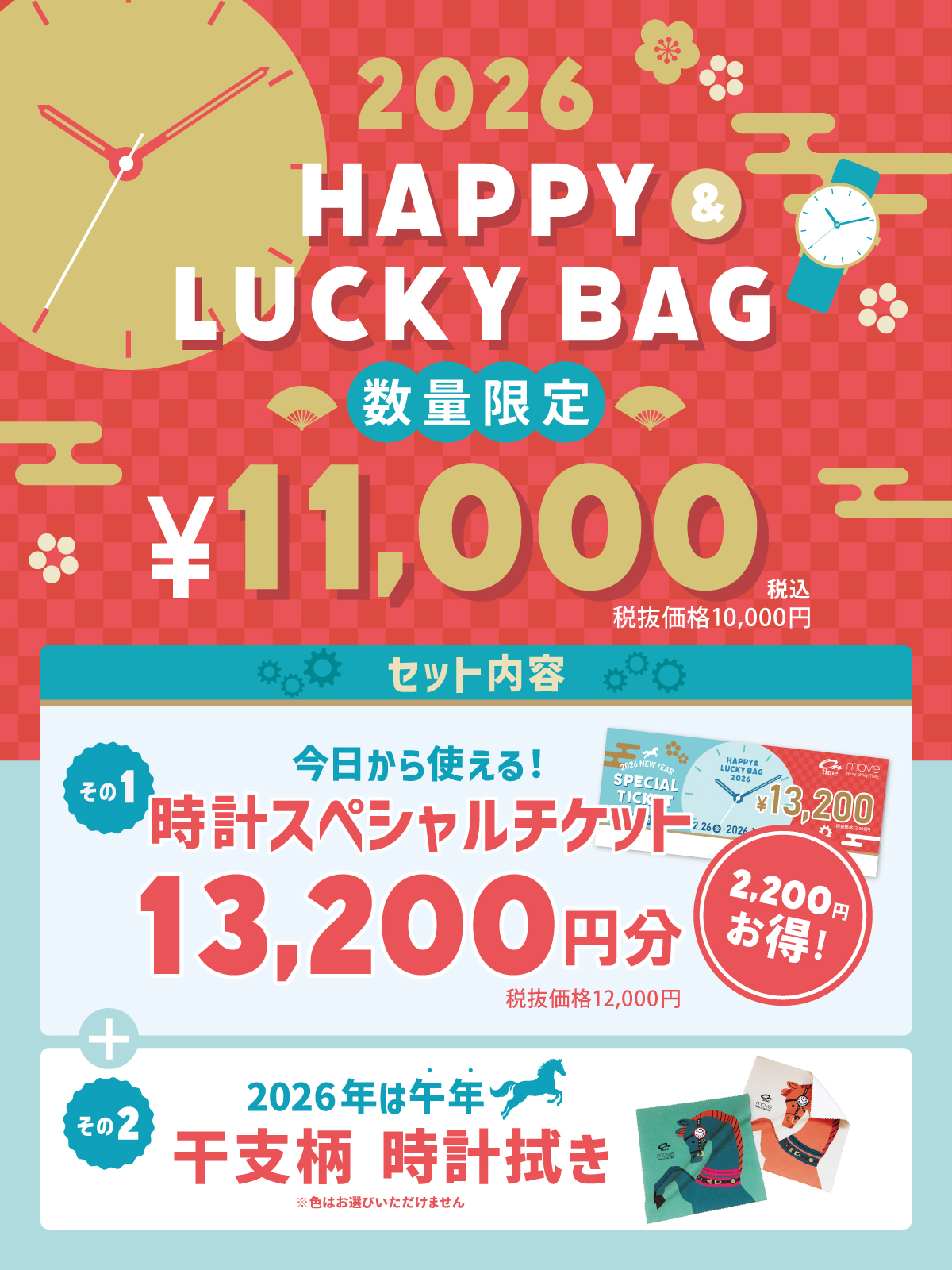 2025年12月26日(金)より、お得な時計スペシャルチケット付きハッピー&ラッキーバッグを販売します!その場で使える、2,200円分お得な「時計スペシャルチケット」と「干支柄(午)時計拭き」が入った、大変お得な内容となっております。無くなり次第終了となりますので、お早めにご利用ください。