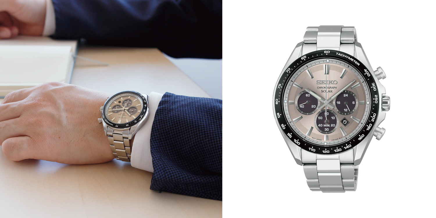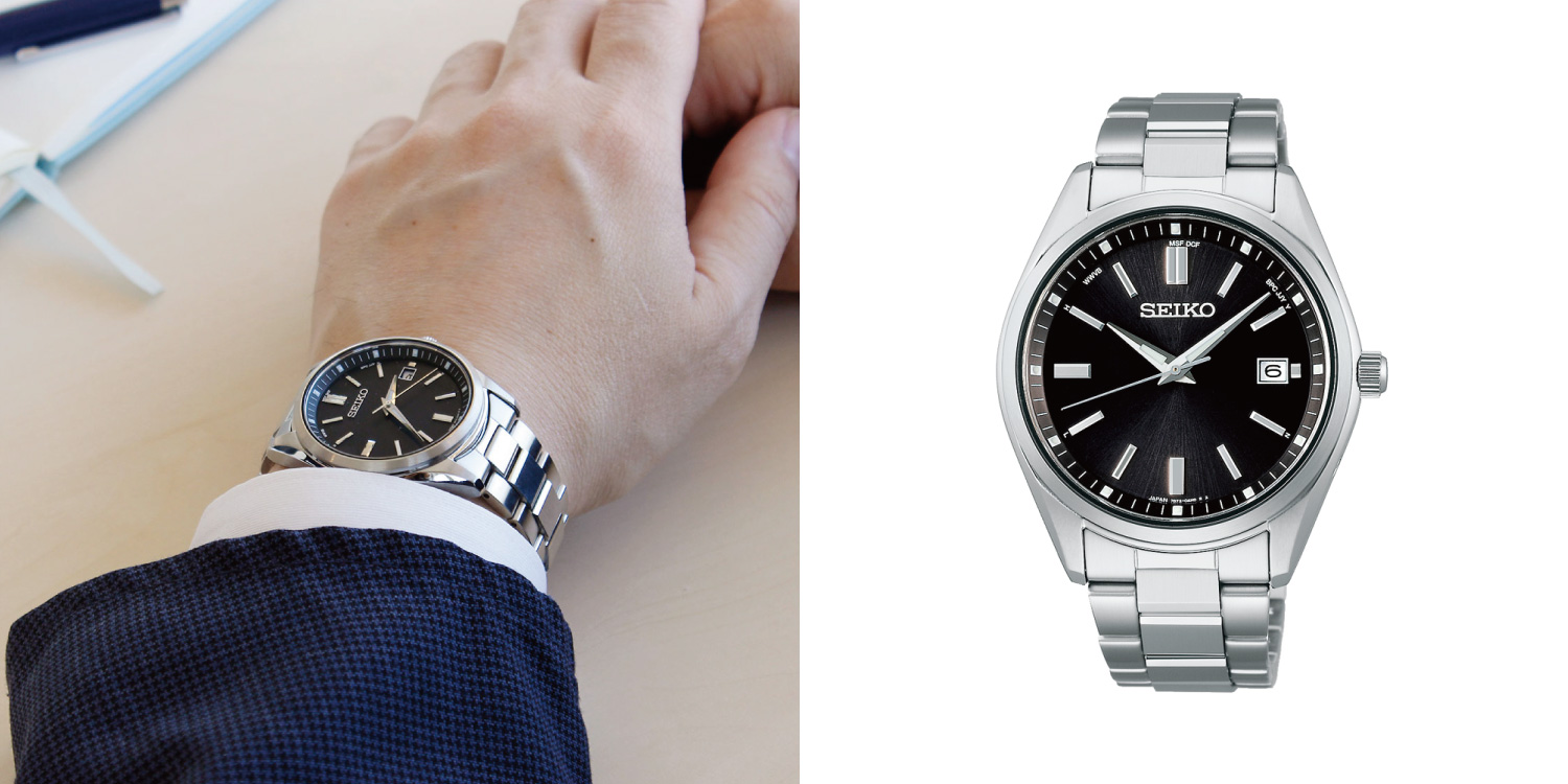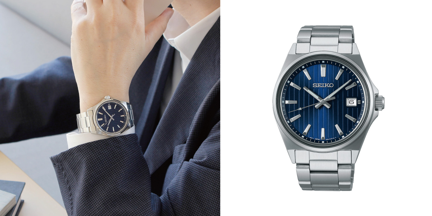金属文字盤の質感を活かした高級感のある仕上がり。エッジの効いたケースデザインはしっかりとした存在感があり、スーツスタイルを格上げしてくれます。