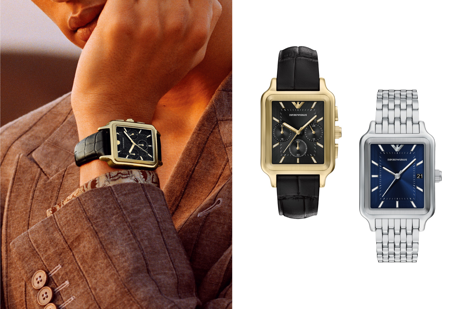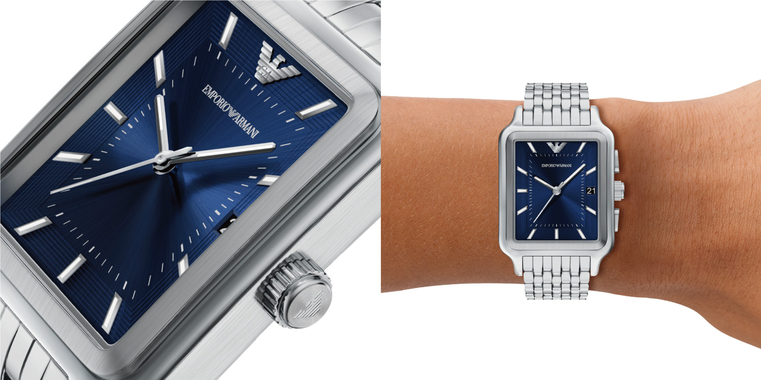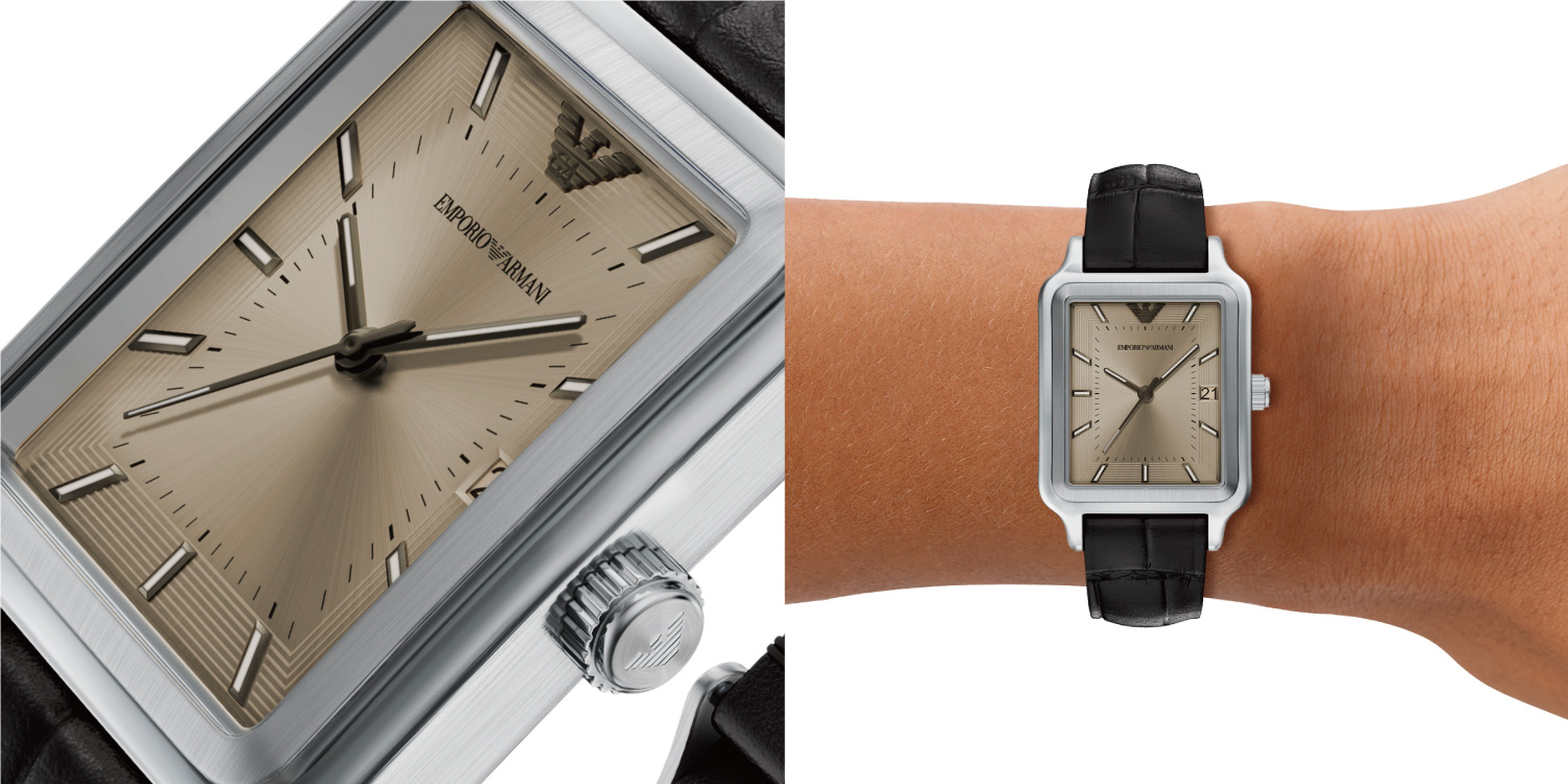 EMPORIO ARMANI(エンポリオ アルマーニ)は1981年にイタリア、ミラノで誕生したブランド。デザイナーはジョルジオ・アルマーニ。着心地と自由な発想を大切にしながら、都会的で洗練されたアイテムの数々を提案しています。この春は、レクタンギュラーケースとシンプルな文字盤デザインが特徴的なモデルが登場しました。エンポリオ アルマーニらしい色使いやトレンドの小ぶりなサイズ感が、春のスーツスタイルを格上げしてくれます。