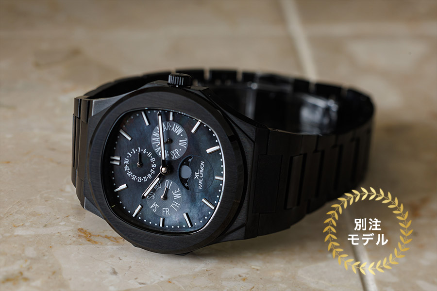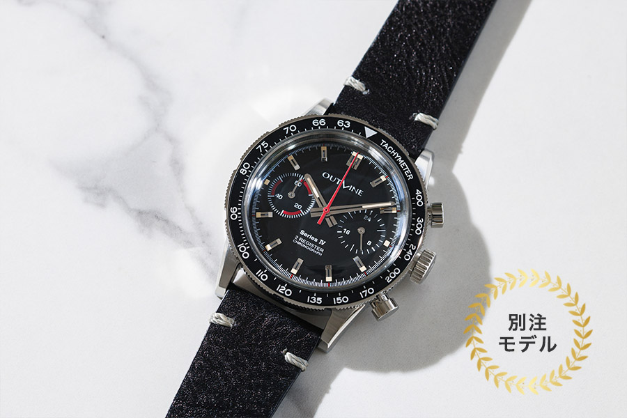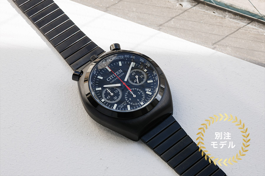 ケースの12時側に配置されたプッシュボタンがツノのように見えることから、「ツノクロノ」の愛称で呼ばれてきたアイコンモデルの限定カラー。ツヤを抑えたマットブラックと鮮やかな赤い針が、レギュラーモデルにはない武骨かつ精悍な顔つきに。