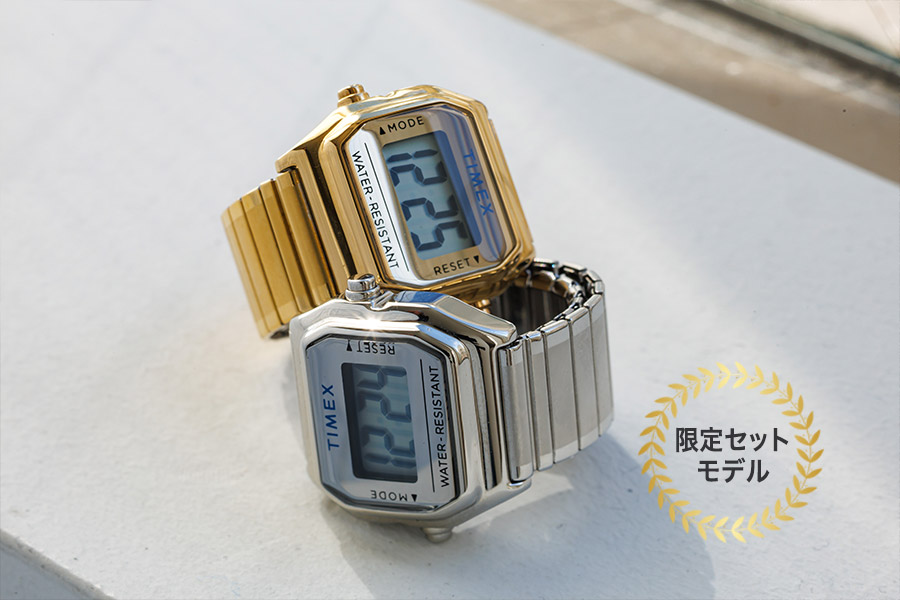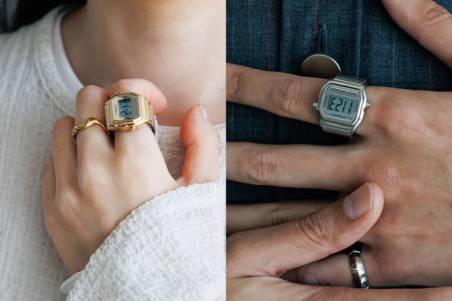 TIMEXのロングセラーシリーズ“角デジ”のミニサイズがベースモデル。そこに時計としてだけではなく、リングウォッチとしても楽しめるように、ショップオリジナルで作成したベルトをセットにしました。ユニセックスなサイズ感で、男女問わず使えます。