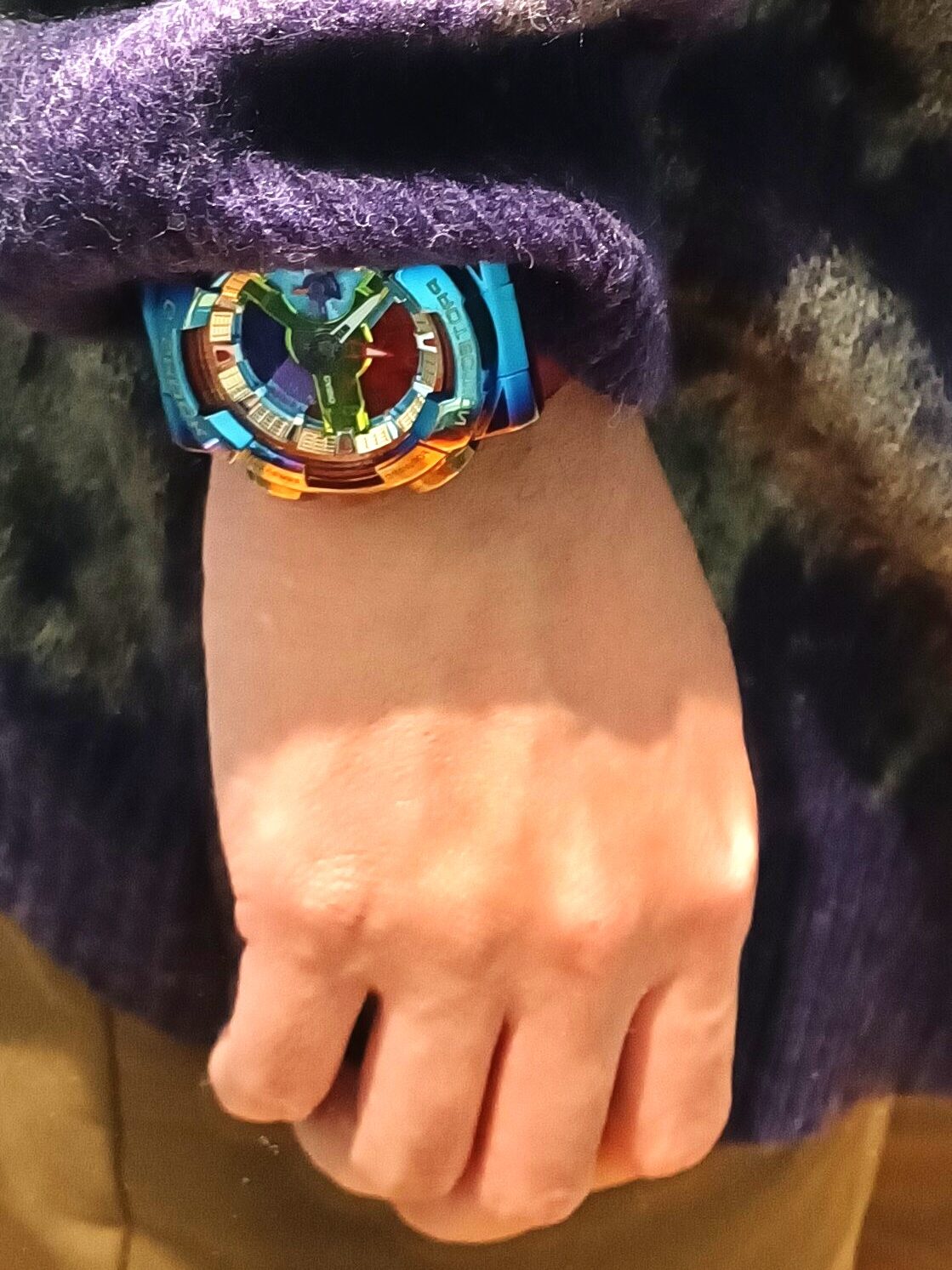 それぞれのオーロラの魅力を引き出した特徴的な白蝶貝文字盤は物々しい雰囲気の機械式腕時計を麗容に仕上げて特別な一品となっております。