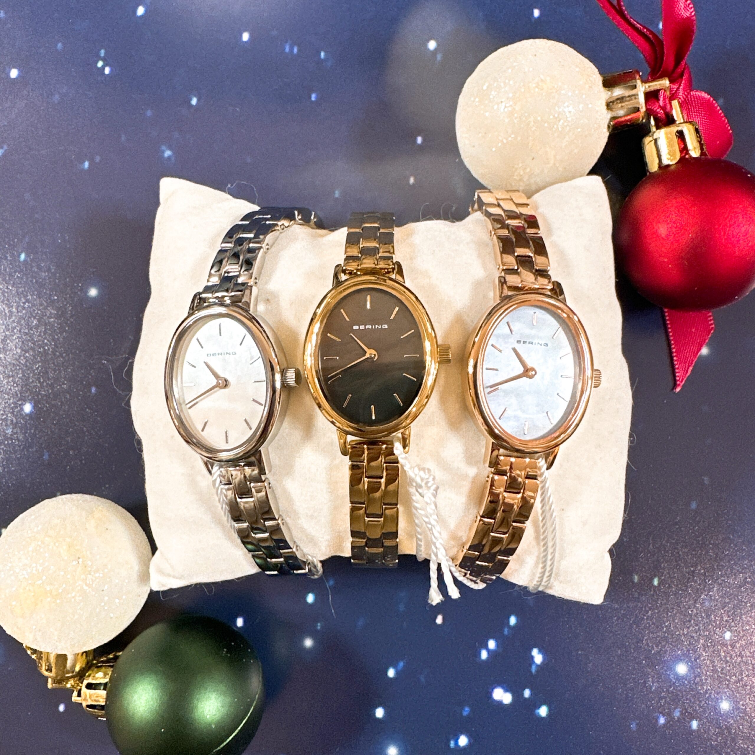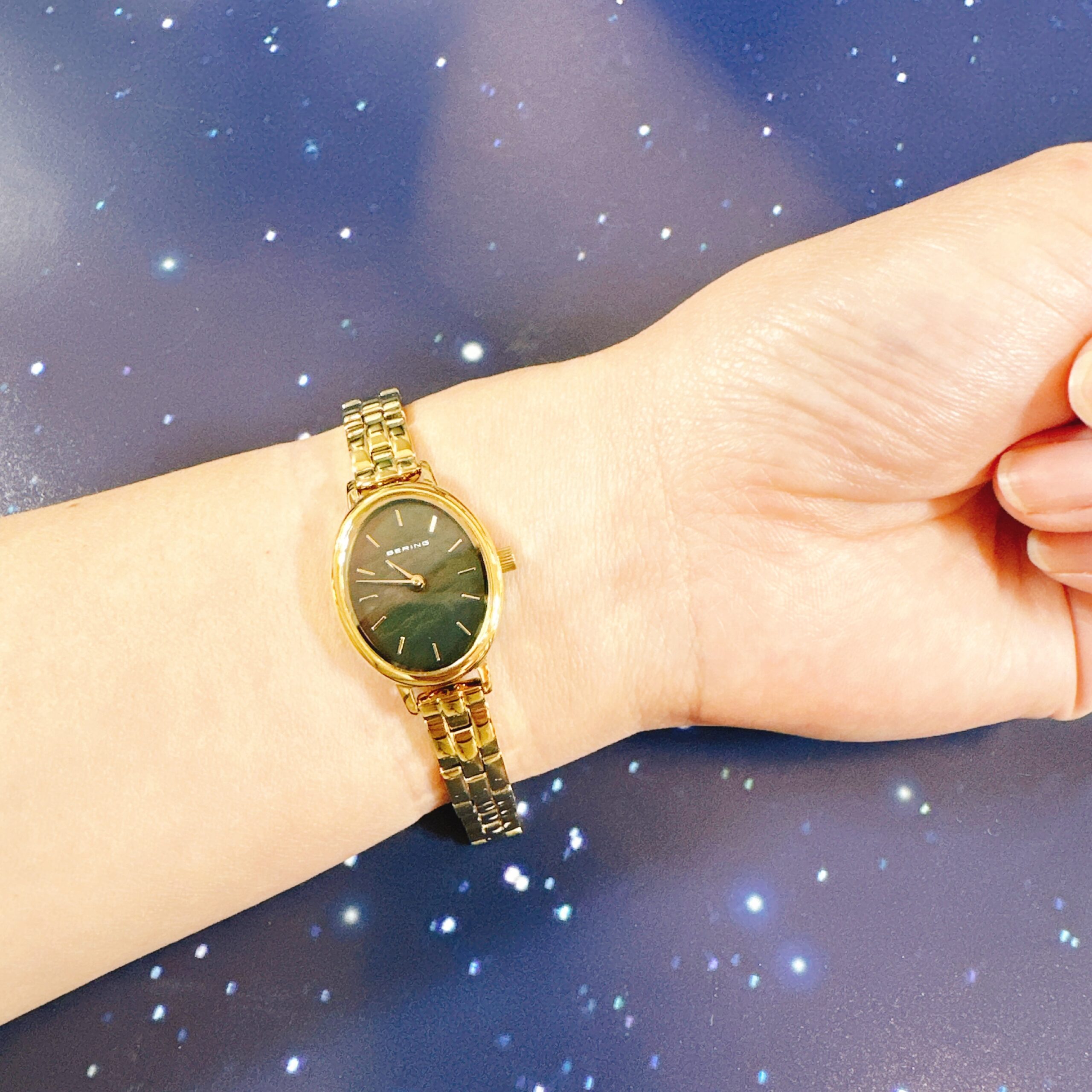 20mmのケースサイズに8mmのブレスとBERINGの中では小ぶりなサイズ感ですが、光により表情の変わる文字盤のマザーオブパールが女性の腕元を輝かせプレゼントにピッタリな1本となっております。