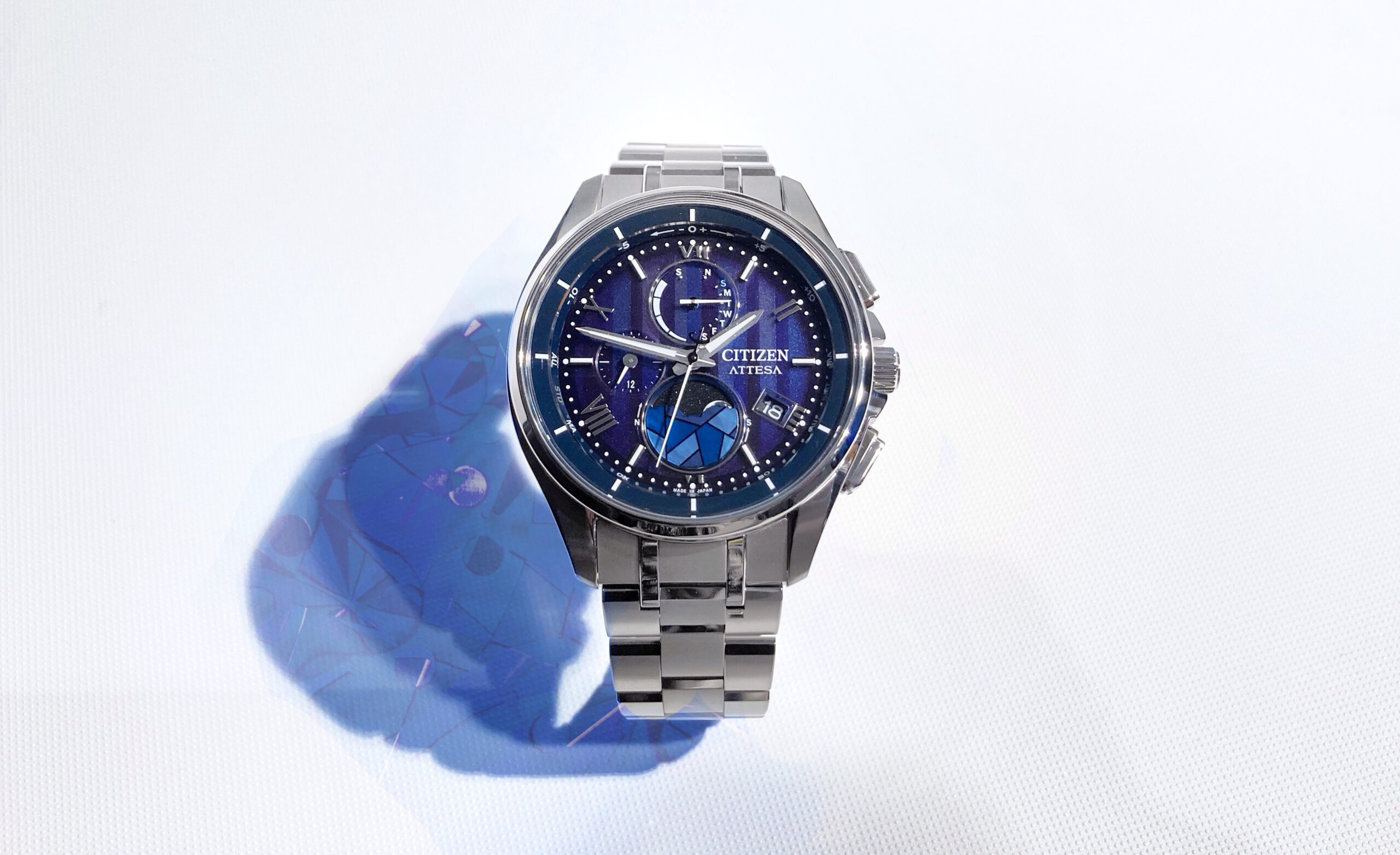 落ち着きのあるブルーの文字板でステンドグラスから降り注ぐ様々な光をイメージしたデザイン。
