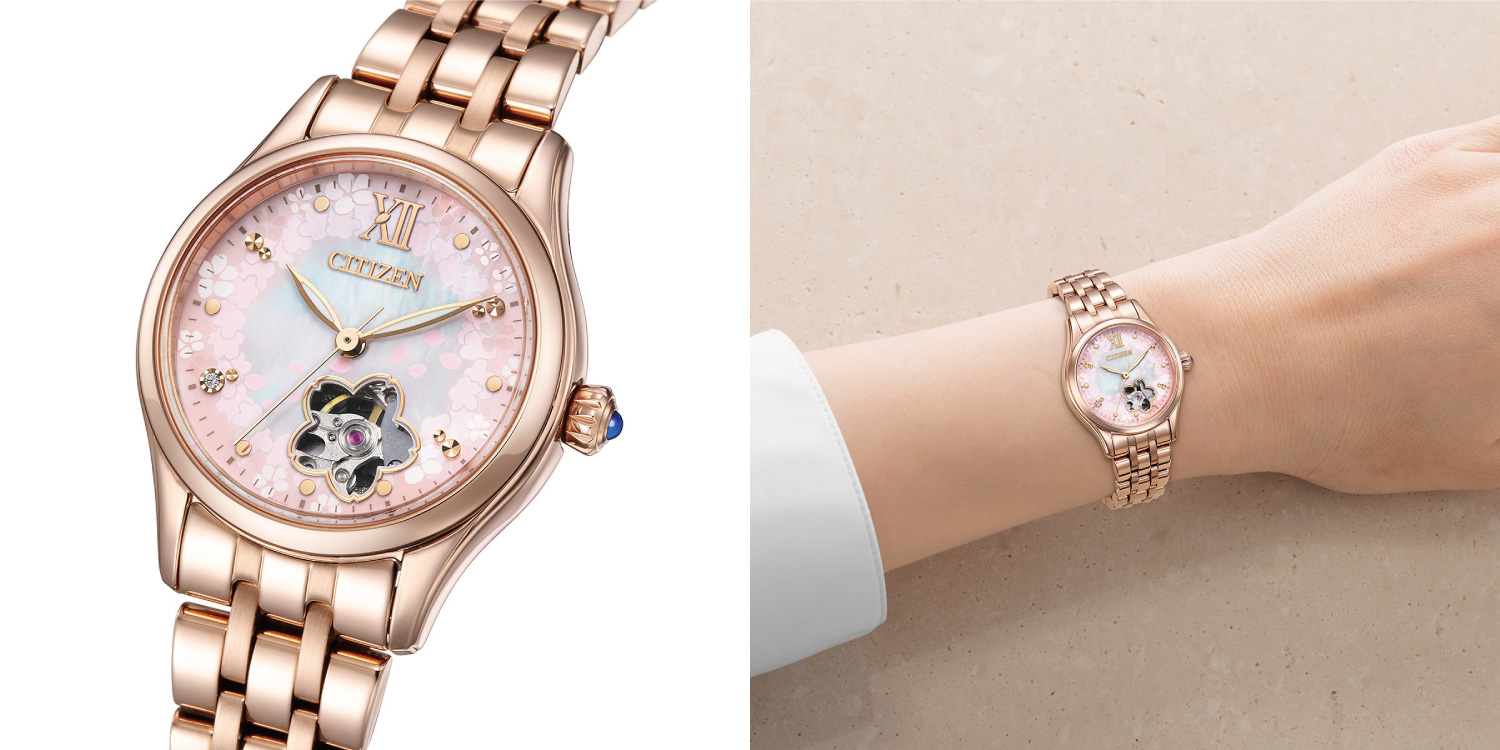 桜の花びらが水面を美しく彩る情景をモチーフにした限定モデル。式時計ならではのオープンハートデザインにも桜の花びらに機械に切り取られています。