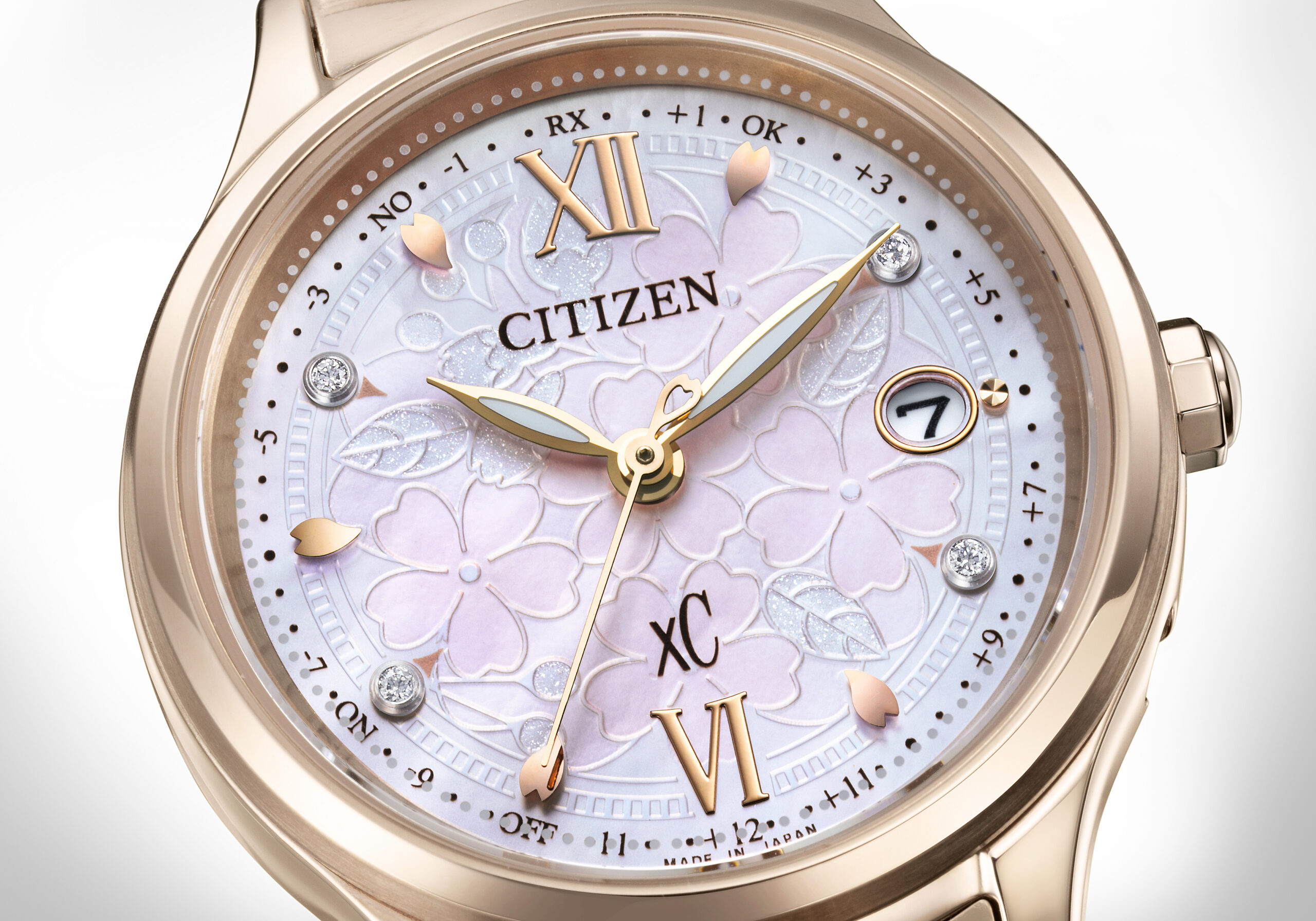 インデックスには桜のつぼみをイメージした4石のラボグロウン・ダイヤモンドが輝き、5箇所の花びら型パーツとともに華やかさを添えます。