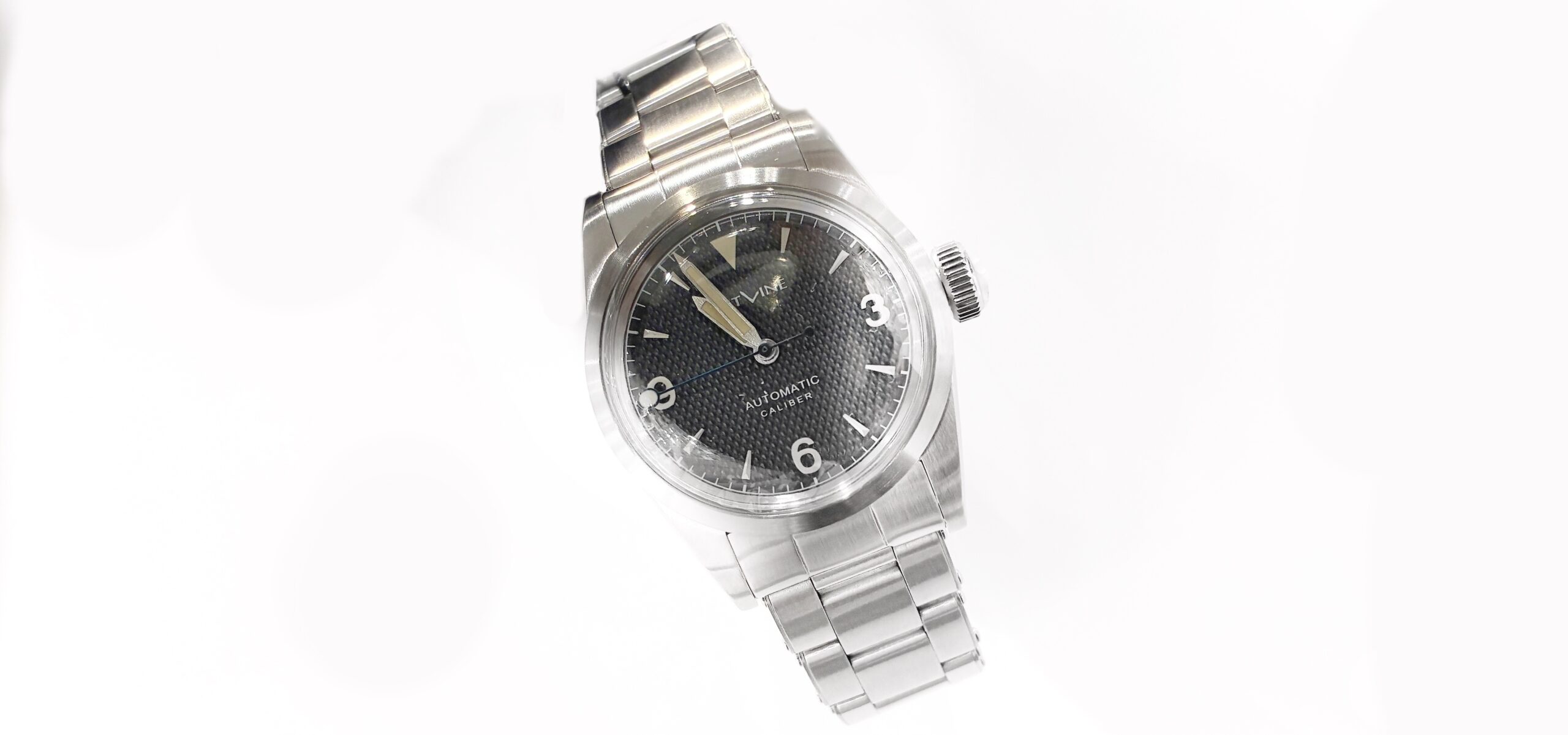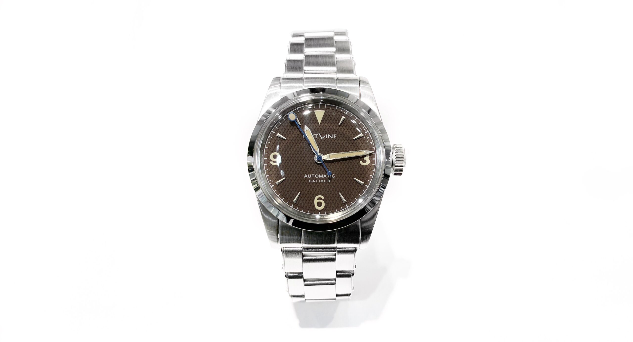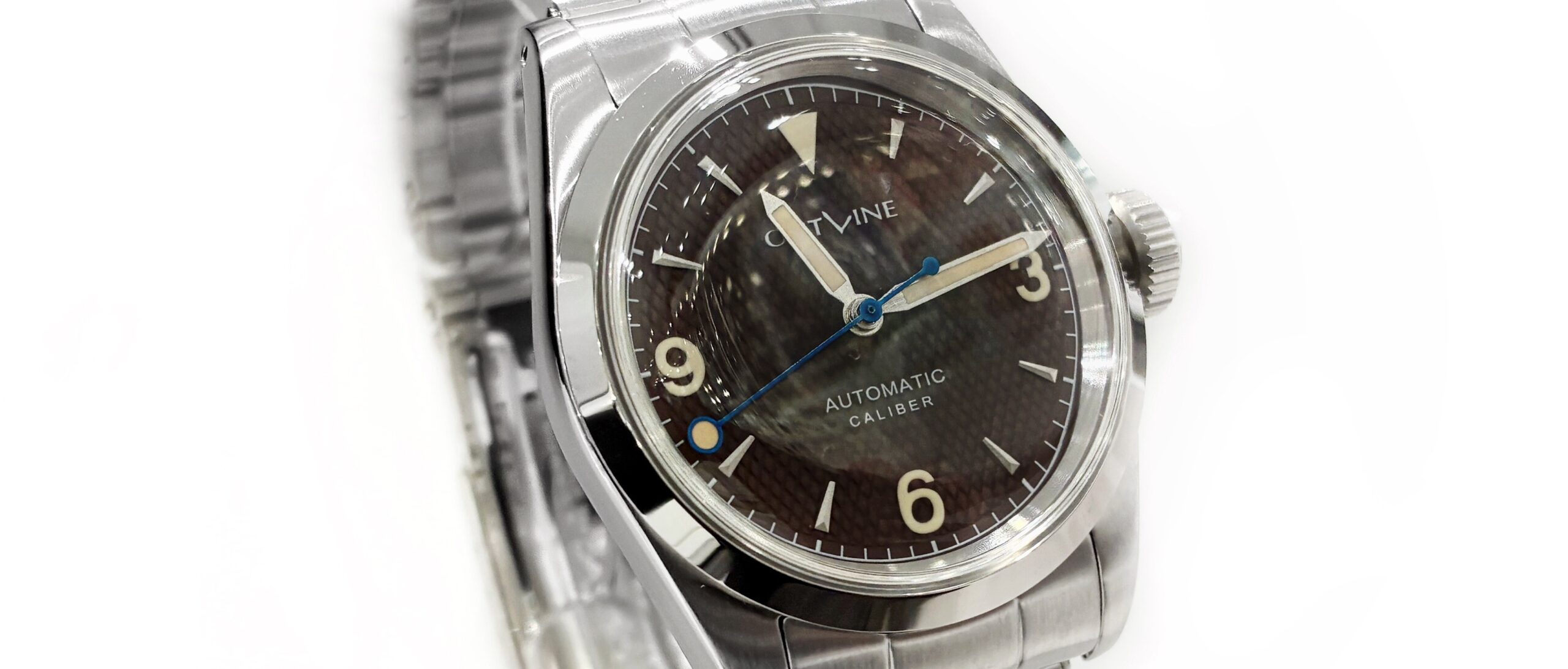 3・6・9のアラビアインデックスをはじめ、くさび形インデックスや36mm径のケースなど全体としてかなりクラシックな雰囲気にまとまっています。