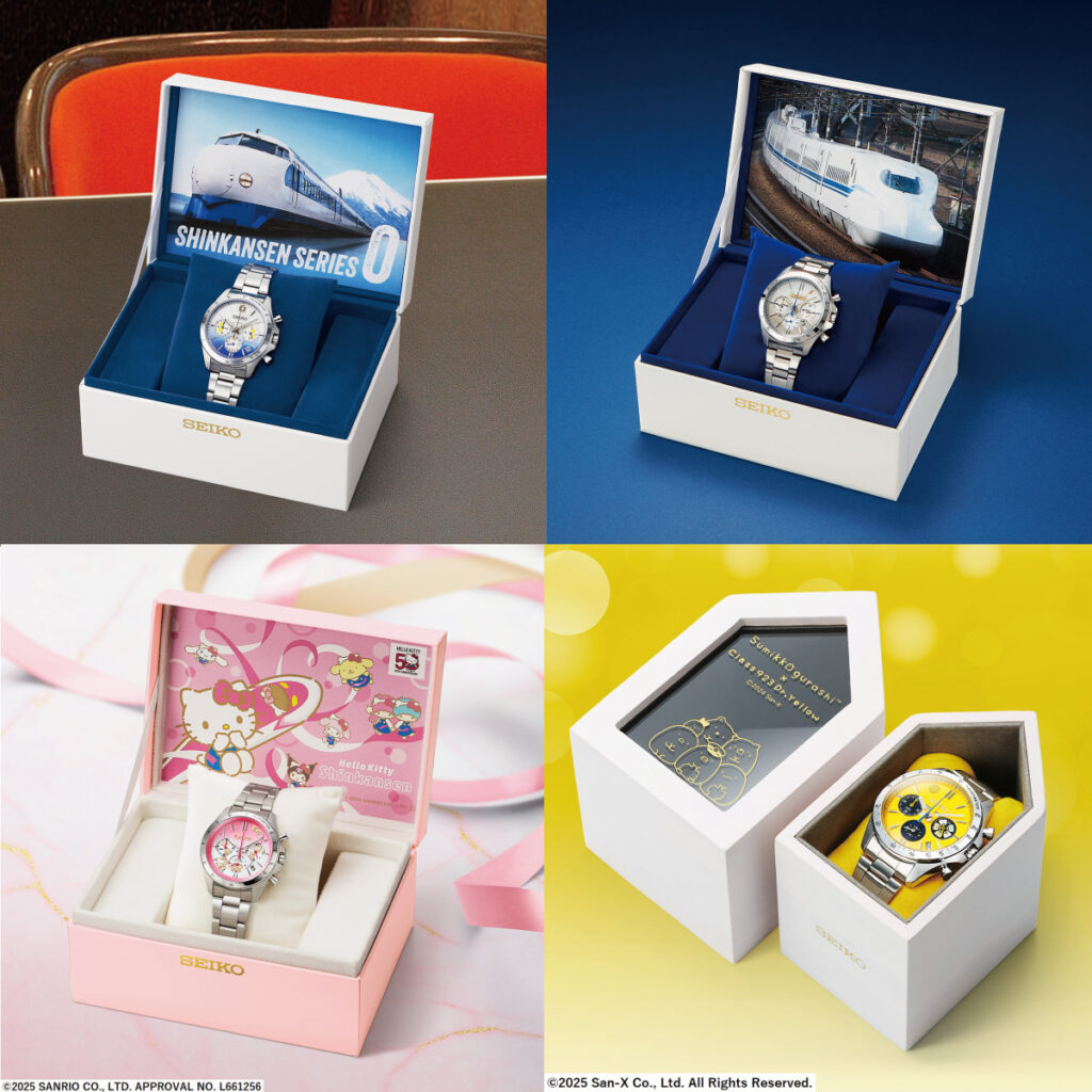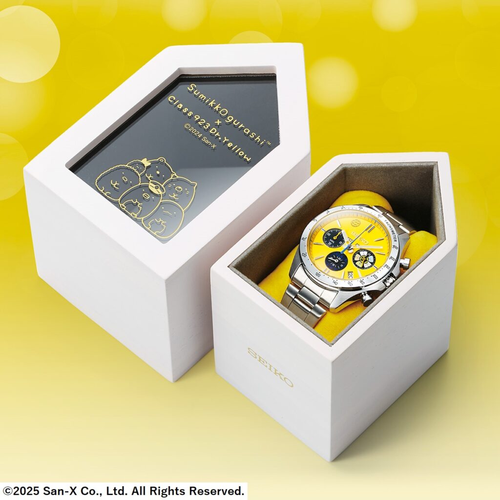「見ると幸せが訪れる」として人気の高い「923形ドクターイエロー」。線路や架線などの設備状況を点検・測定し、新幹線の安全を支え続けている車両に、「すみっコぐらし」ならではの健気なイメージを重ねた、セイコー製のコラボウオッチが登場しました。印象的な黄色の文字盤はドクターイエローの車体にちなんだカラー。帯を思わせるインデックスの深いブルーのラインがアクセントを添え、3 時のインダイヤルには車窓からこちらをのぞくすみっコたちが表現されています。鮮やかな彩りと遊び心のあるデザインが、幸せに満ちた時を演出する限定版クロノグラフモデルです。