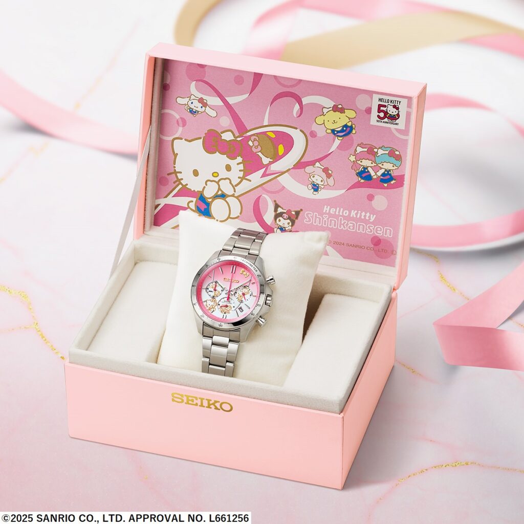 「かわいい500系」として大人気―新大阪~博多間を絶賛運行中の500系「ハローキティ新幹線」が登場。 文字盤に広がるのは、500系「ハローキティ新幹線」にちなんだピンク&ホワイトのグラデーション。3つのインダイヤルを結ぶ放物線が、500系のスマートなロングノーズを思わせます。1時と7時のインデックスで金色に輝くのは、キュートなポーズのキティちゃんとトレードマークのリボン。さらにシナモロールやクロミといったサンリオの人気者たちが、インダイヤルをにぎやかに彩ります。ステンレスのクールな輝きに映えるピンク&ホワイトのカラーリングは、男女を問わず好感度抜群。今こそ手にしておきたいスペシャルモデルです。