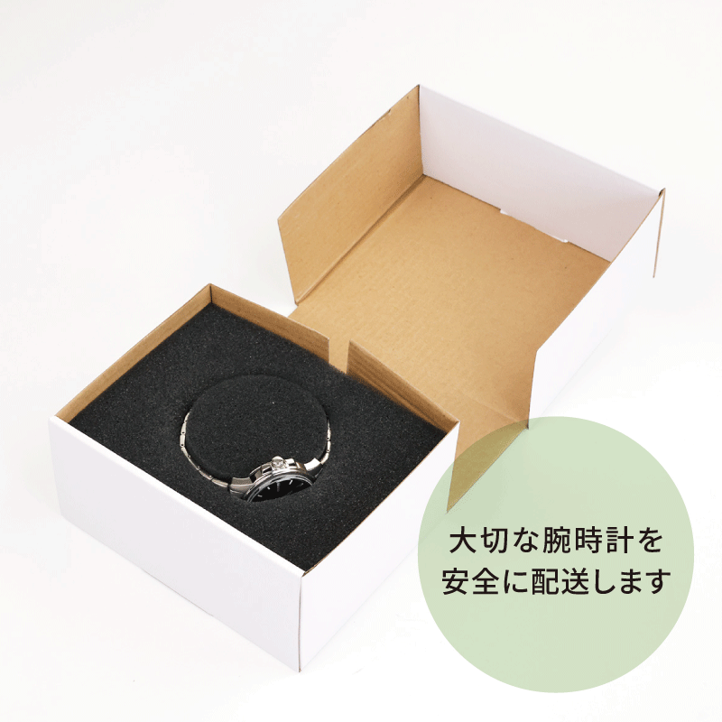 お客様からWEB時計修理工房へ配送するための専用配送キットをご用意しております。段ボールや緩衝材の準備は不要。大切な腕時計を安全に配送いたします。