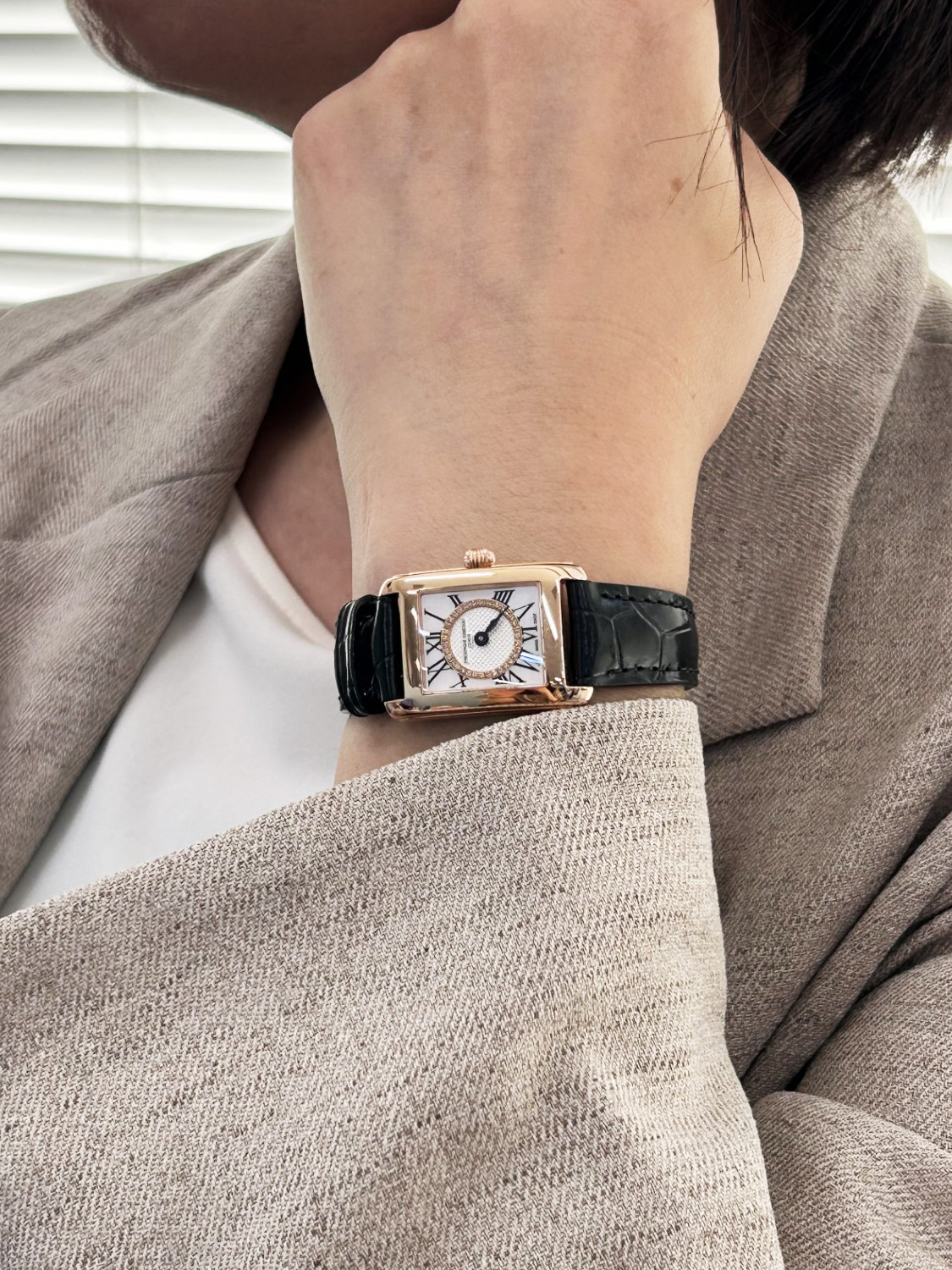 シンプルなニットに合わせたのは、北欧ブランド「スカーゲン」のスクエアウォッチ。シンプルながら存在感あるケースと、差し色のレッドがお気に入り。