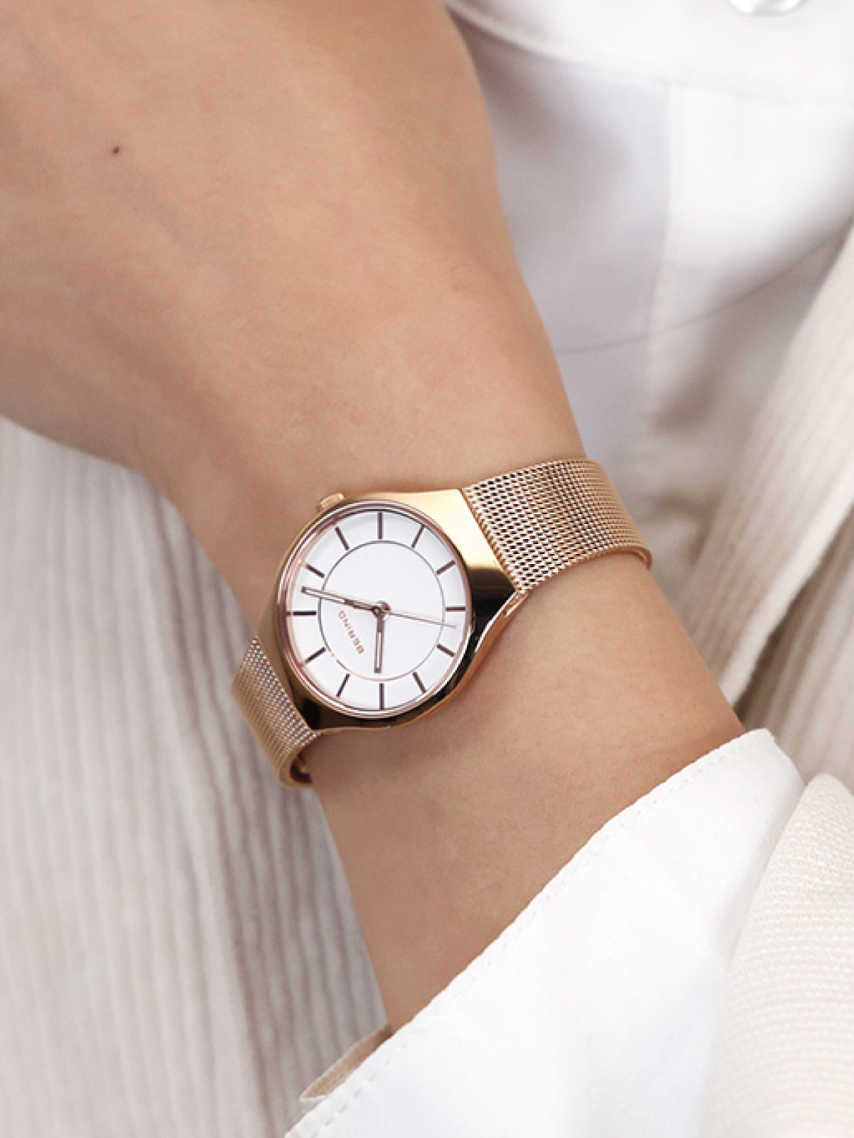 シンプルなデザインなのにかわいい腕元にしてくれるピンクゴールドがお気に入り。白のコーディネートに白文字盤を合わせてみました!