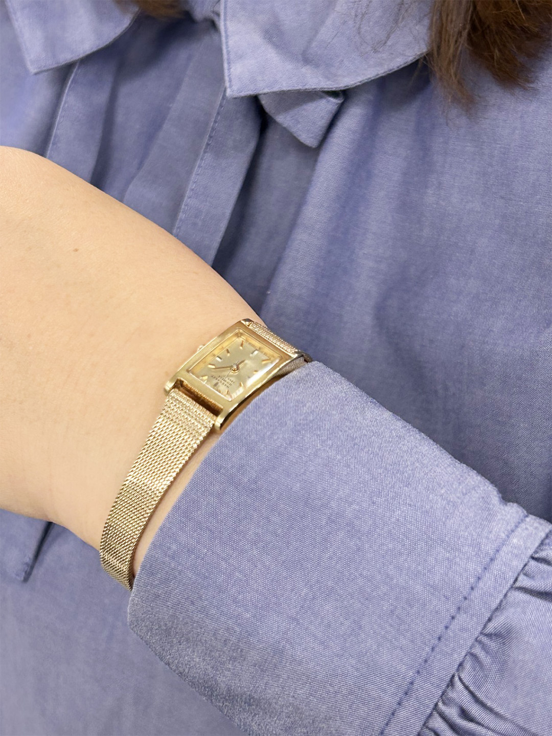 落ち着いた色味のブラウスが多くなるので、腕元はきらりと輝くゴールド系が映えます!肌なじみの良いゴールド色と、繊細なブレスレットの形状がとっても綺麗で、お店でも人気のモデルでした!