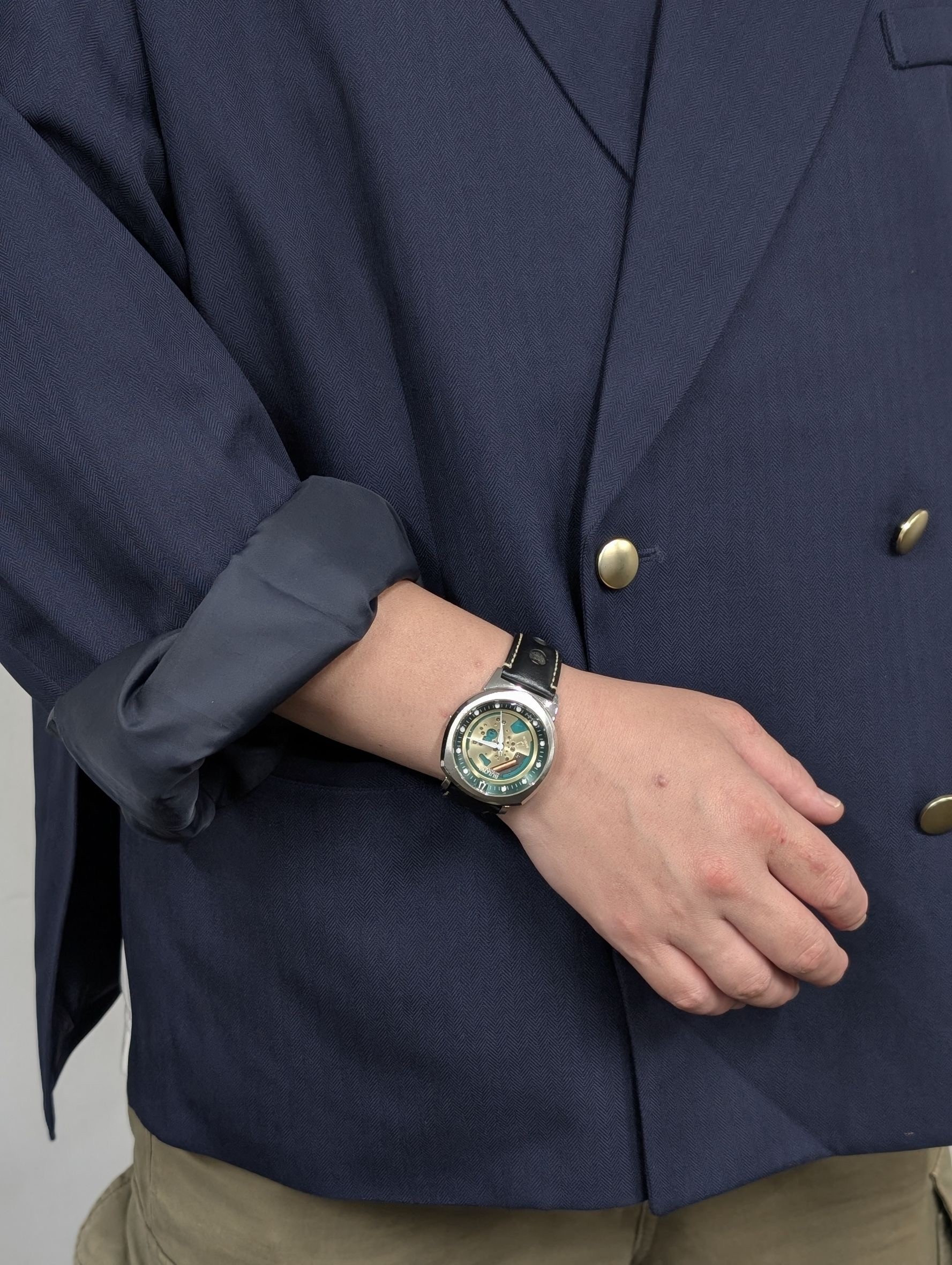 1960年にブローバが発表した世界初の音叉式電子時計アキュトロン。その当時のオリジナルモデルをイメージし復刻したモデルです。通常のベルトからパンチングレザーに変更しより個性を出しています。