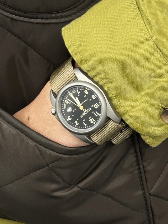 今日はアメリカのミリタリーウォッチブランドBERTUCCI(ベルトゥッチ)をチョイス。日本ではあまり知られていないブランドですが、ここのデザイン好きなんです。無骨なデザインですがチタンケースなので軽くて着け心地は◎ カジュアルなスタイリングに相性抜群です。