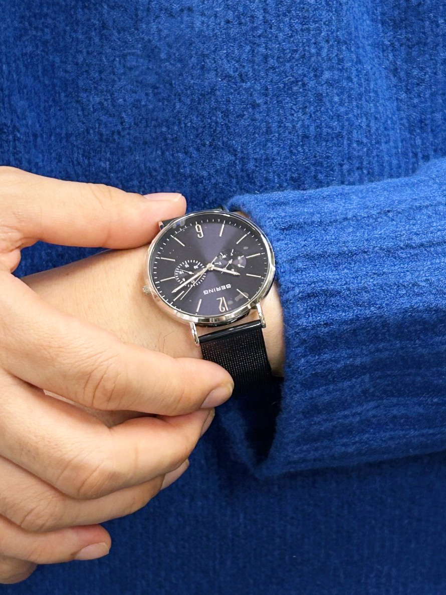 青いニットに合わせて青い時計を選びました!ベーリングで人気の「チェンジズ」はストラップがセットになっているので、自分で付け替えを楽しんでいます。