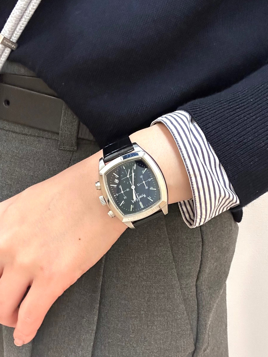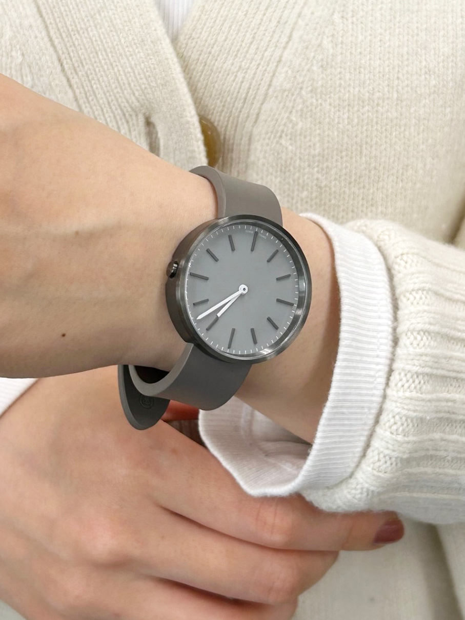 文字盤からブランドロゴさえ失くしてしまうほど、極限まで無駄を省いたミニマルなデザインが特徴的。ラグ部分が外側になく丸形のシンプルなケースデザインもお気に入りです!