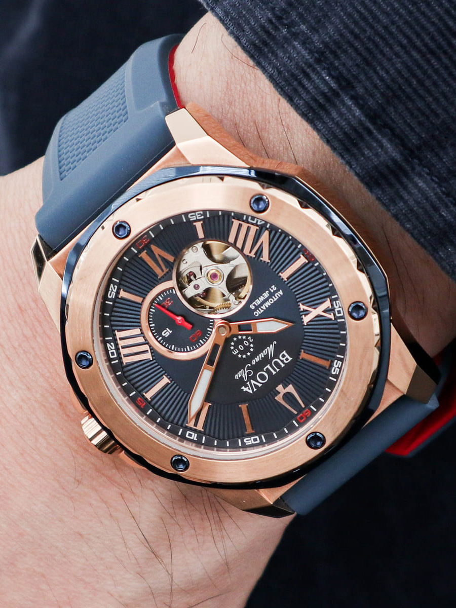 高い防水性や大胆な色合いのシリコンラバーベルトなど、スポーティな仕上がりでありながら、全体的にラグジュアリーなデザインが特徴的。ムーブメントの動きが見えるオープンハートデザインはスーツスタイルにも取り入れたい、大人な一本です。