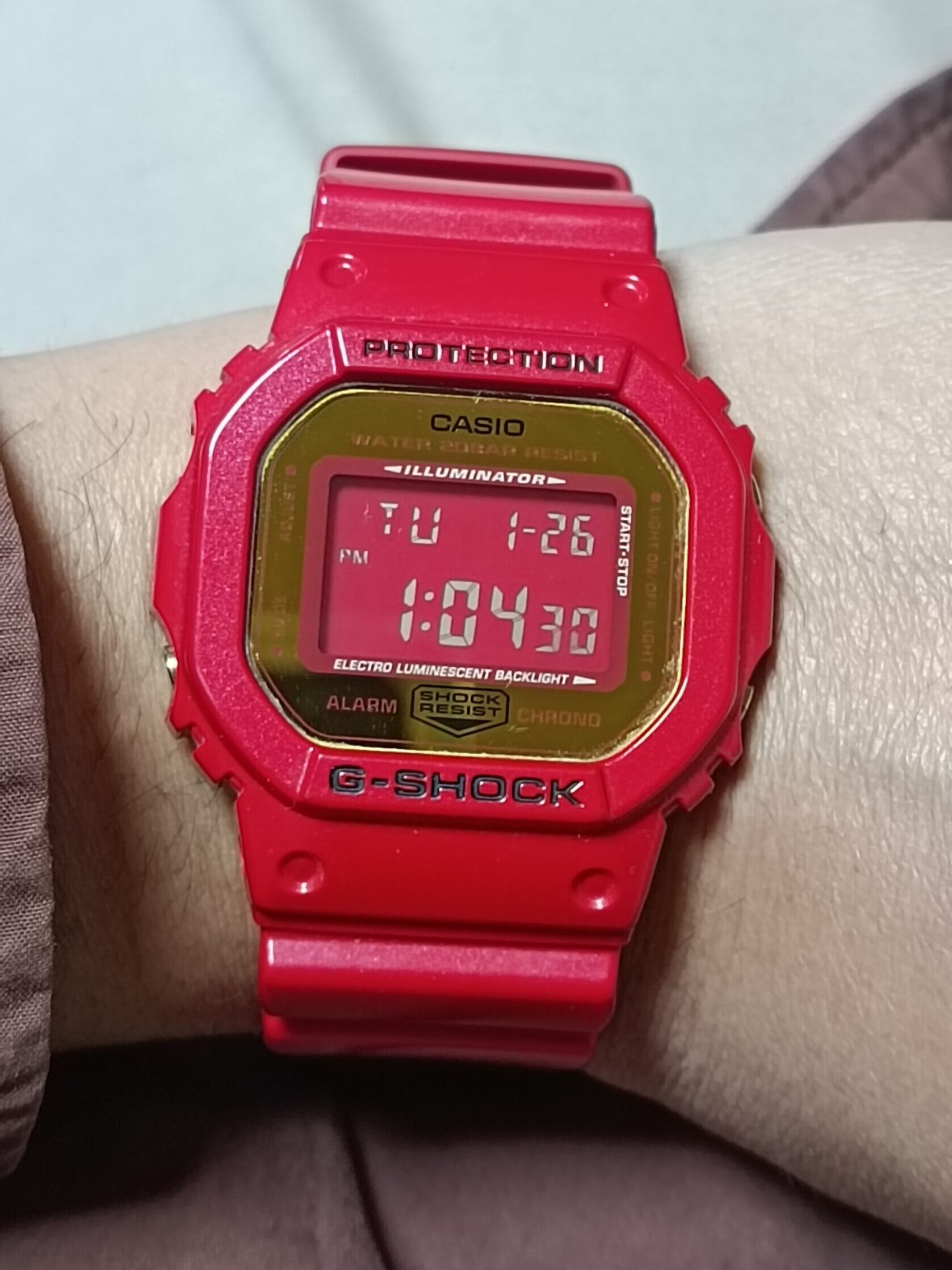 深いレッドにゴールドの腕元が一気に主役になるタイプ、存在感があります。