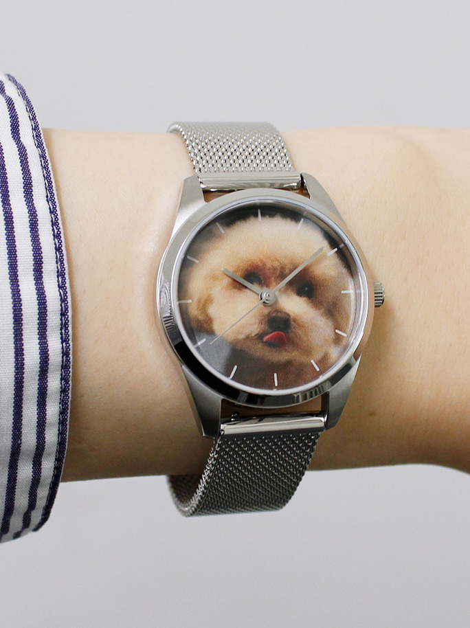 マイクリエーションで作った、オリジナルデザインの腕時計です。愛犬のりんごちゃんです。これでいつでもどこでも一緒。