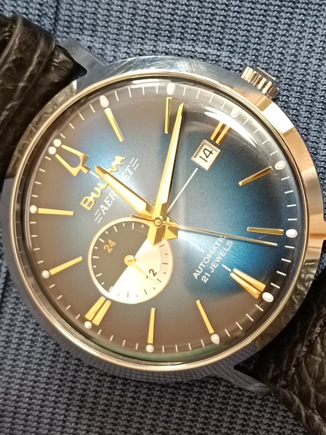 ブローバはネイビー信頼感がある彩、クラシック寄りのデザイン、金色のインデックスと針が上品で、落ち着いた雰囲気を強め、つけやすい(笑)